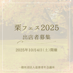 栗フェス2025出店募集開始!!今年は10月4日(土)に栗フェスを開催します!!昨年は悪天候の中16,000人もの方々にご来場いただきました。今年は20,000人の来場に向けて現在計画をしています!さて、栗フェスの主役で […]